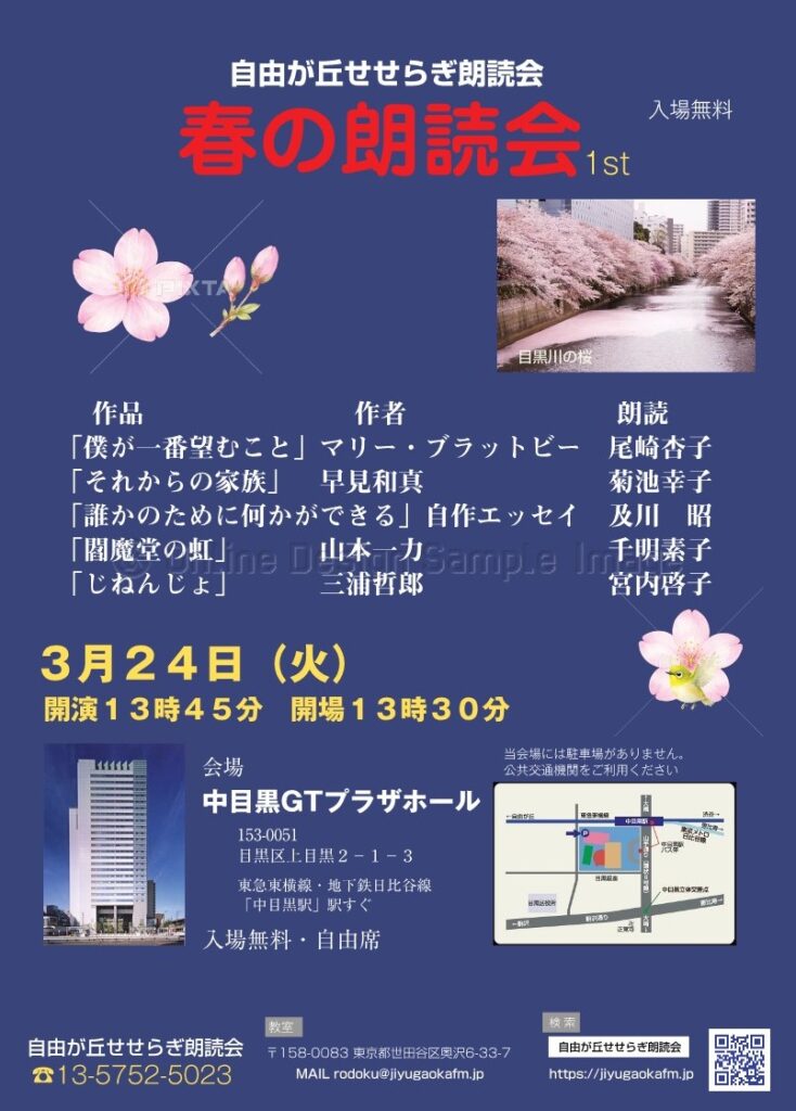 「春の朗読会1st」 3月24日(火)めぐろGTプラザホール 開演13:45(入場無料)